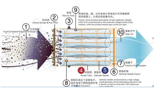 電場(chǎng)的設(shè)計(jì)使廢氣粒子的運(yùn)動(dòng)速度較低,一般在零點(diǎn)幾秒內(nèi)便能使廢氣粒子荷上足夠的電荷,帶電粒子在電場(chǎng)中會(huì)受到電場(chǎng)力(庫(kù)侖力)的作用,其結(jié)果是油煙粒子被吸附到陽(yáng)極上。因此凈化率非常高,而且特別適用于捕捉粒徑較小和重量較輕的廢氣粒子。